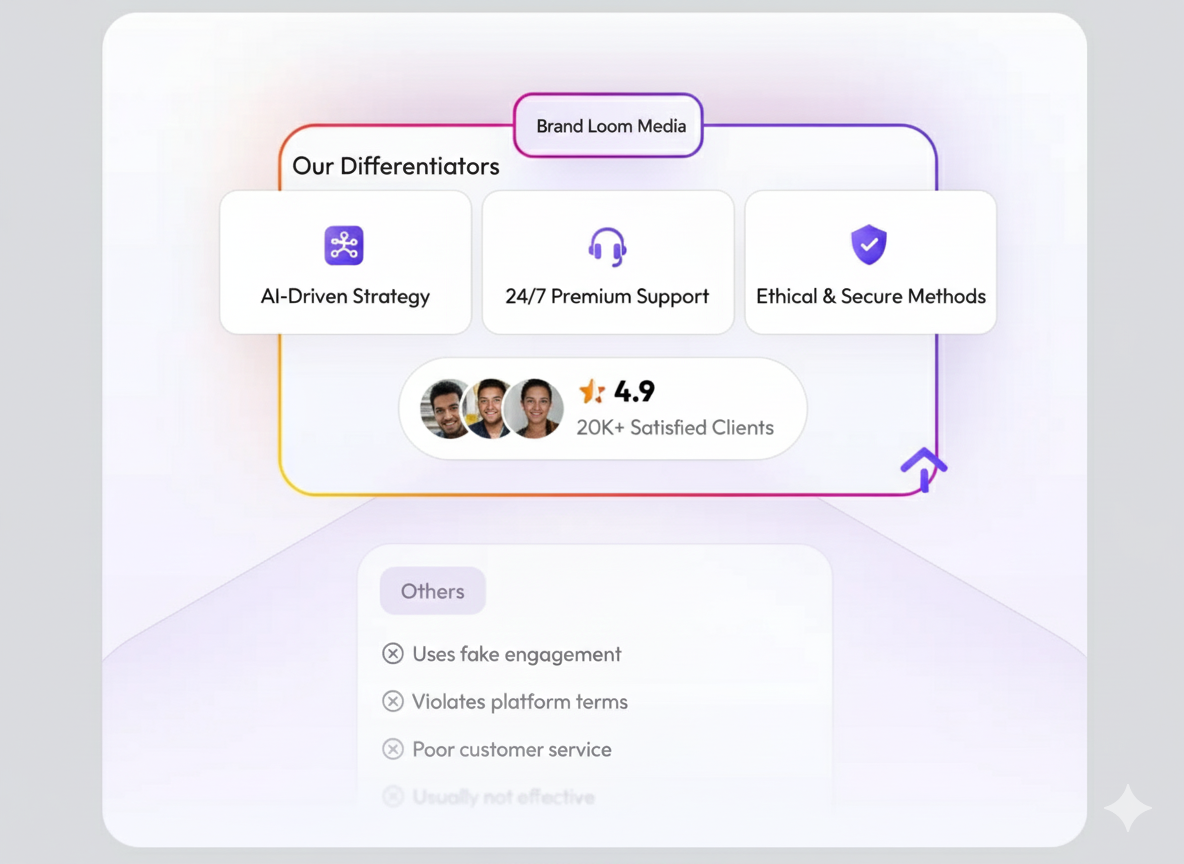 We don’t cut corners. While most services rely on bots, fake engagement, or vague promises, Brand Loom Media delivers real, intentional growth through human-powered strategies and complete transparency. Our goal is to build lasting results you can genuinely trust.
